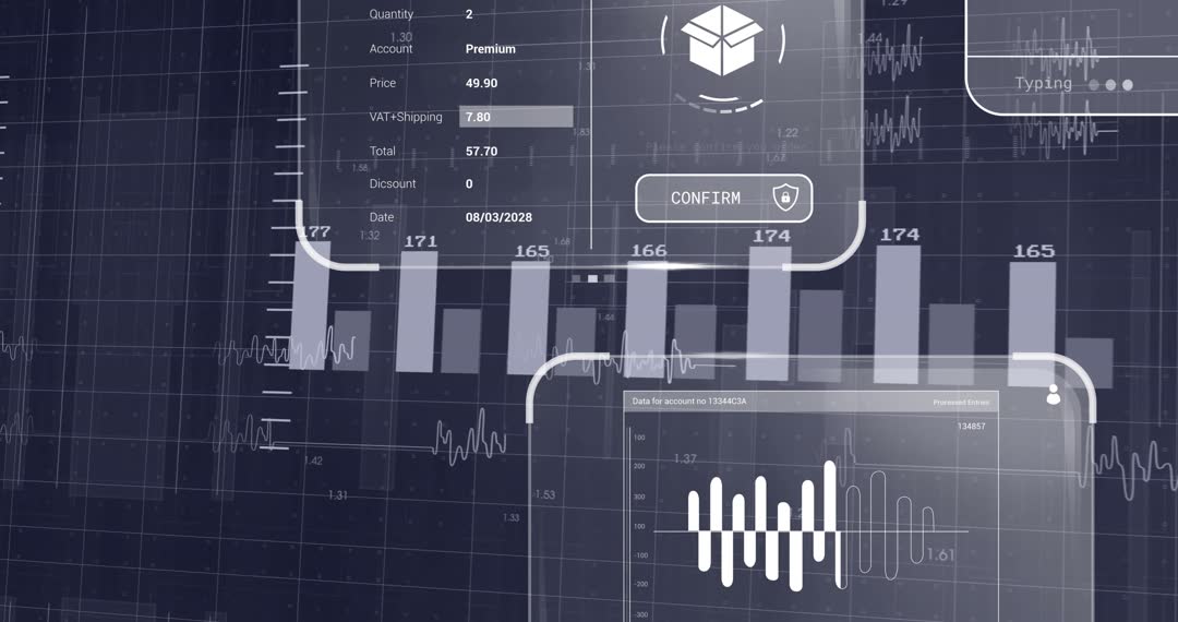 Animated depiction showcasing digital graphs and a financial data interface on a computer screen. Featuring dynamic graphs and charts, it encompasses elements like quantity, price, costs, and confirming actions in financial transactions. Ideal for presentations about finance, analytics, technology trends, or investment strategies. Useful for educational content, finance seminars, technology workshops, and demonstrating modern financial data management methods.