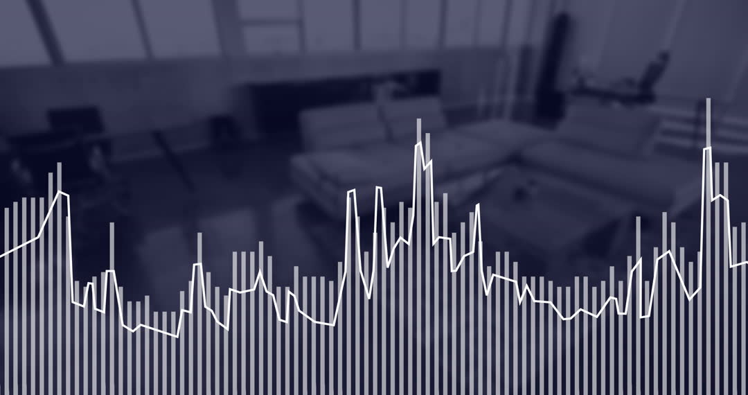 Conceptual digital overlay showing animated financial data graph over a blurred modern office background. Useful for illustrating concepts related to business finance, digital technology, data analytics, and workspace environments. Ideal for presentations, financial reports, marketing materials, and tech stock videory.