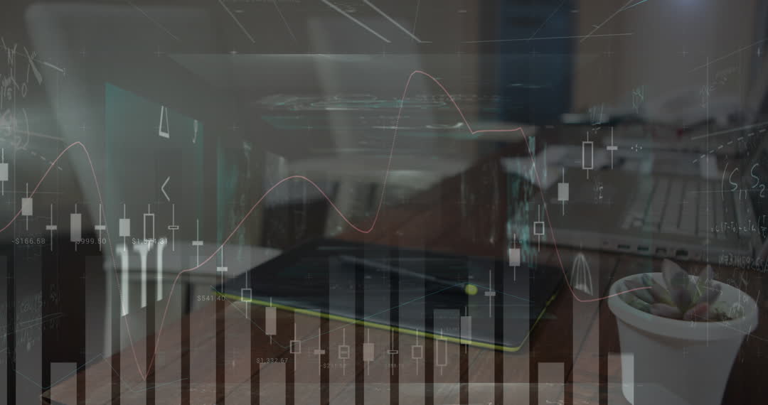 Animation depicting financial data including stock market charts and graphs overlaying with an video of an office desk featuring a tablet and other items. Suitable for illustrating futuristic financial technology concepts, data analytics in a business setting, or articles about global finance trends.