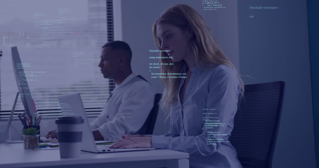 Young professionals working at their desks with overlaid computer code, illustrating global financial data processing. Perfect for use in tech industry, finance, or business workflow presentations and content about modern workspace environments.