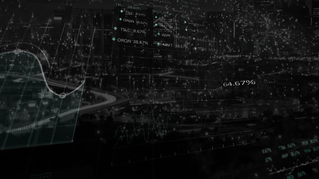 Digital transformation of financial data over an illuminated cityscape highlights the intersection of finance and technology. Ideal for illustrating concepts of modern financial analytics, investment strategies, urban financial markets, or high-tech financial services in presentations, websites, and multimedia projects.