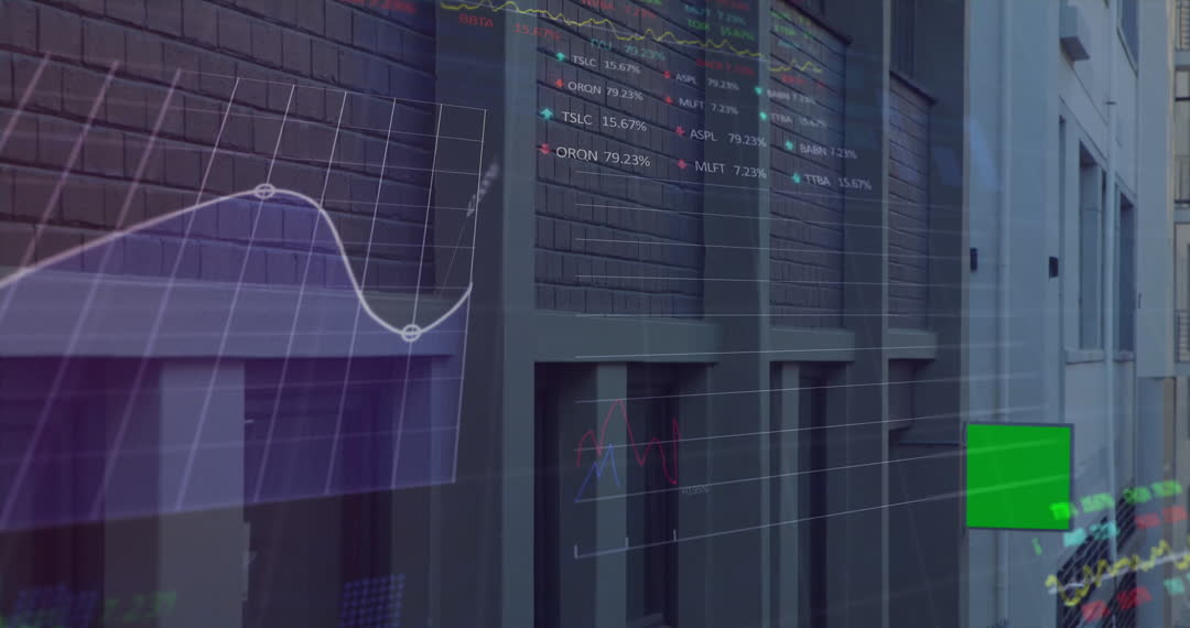 The visual represents an animated overlay of financial data dynamically cascading over a contemporary city building. This video symbolizes economy transformation, technology integration into urban landscapes, and innovative trends in financial markets. Ideal for illustrating concepts related to global finance trends, investment strategies, economic forecasting, and the intersection of technology with urban environments in digital media, presentations, or corporate communications.