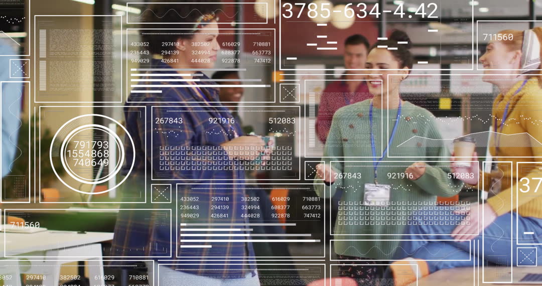 Diverse business group animated alongside digital financial data connecting concepts of finance and technology. Ideal for illustrating themes of modern business environments, data analysis, and innovative thinking in presentations or marketing materials.