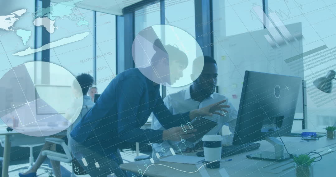 Diverse team engaging over computer in modern office with superimposed financial animations suggesting international profitability and data processing strategies; suitable for content on global business strategies, financial technology, diverse teamwork, and data-driven decision making.