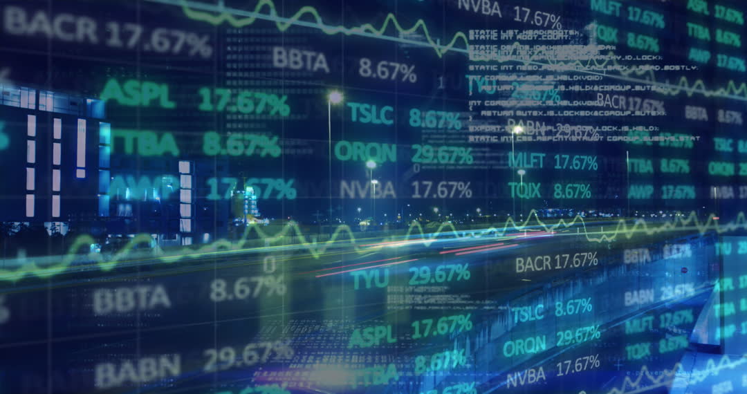 Visualizing stock market growth through animated financial graphs and statistics over a busy city at night. Ideal for presentations on financial markets, economic growth, or technological advancements in trading and data analysis.