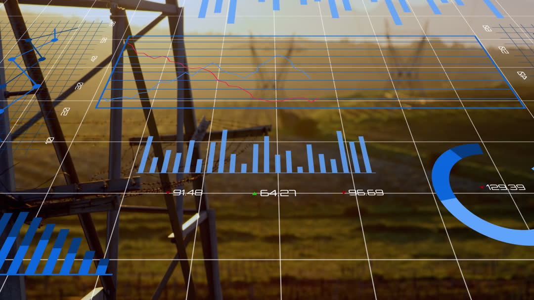 Dynamic visual of economic data projected over silhouettes of industrial pylons during sunset. Represents the intersection of technology, finance, and infrastructure. Ideal for use in economic trend analysis presentations, website backdrops for technology firms, or educational content about global finance systems.