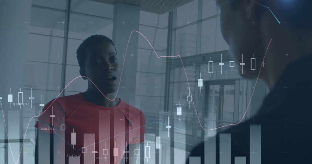 This illustration features animated financial graphs superimposed over two diverse women engaged in a business conversation within a modern office space. Ideal for presentations or campaigns emphasizing innovation in finance, gender equality in the workplace, or modern business strategies. Useful for websites, articles, or brochures focusing on diversity in finance and strategic discussions.
