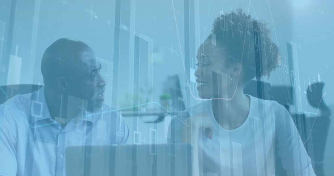 Animated scene featuring abstract digital charts imposed on two business professionals having a discussion. This modern visual illustrates themes of global business and data-driven strategies. Suitable for presentations, financial technology content, and articles on collaboration and innovation in a corporate environment.