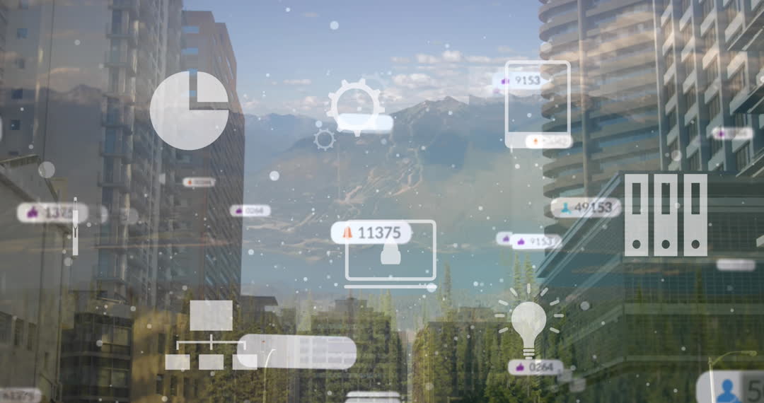Animation depicting financial statistics and social media icons overlaid on a transparent cityscape, symbolizes global communication and connectivity. Perfect for use in business presentations, financial analysis videos, and content related to social media impact.