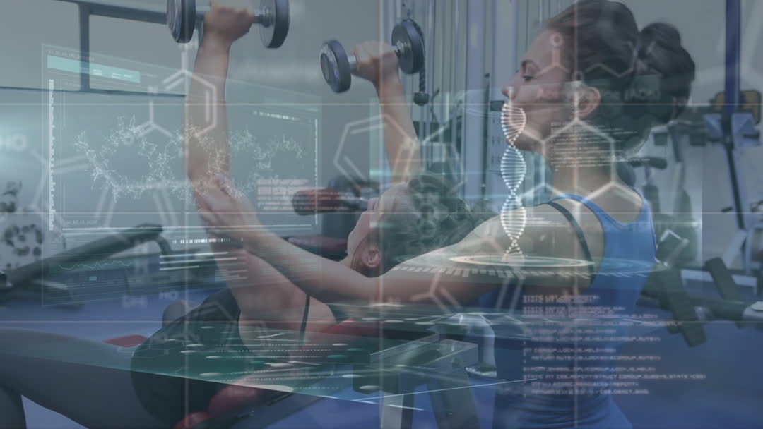 Animation blending gym environment with futuristic technology elements, illustrating modern fitness fusions and educational visualizations. Useful for presentations on innovations in fitness, tech-integrated workouts, or futuristic health interfaces.