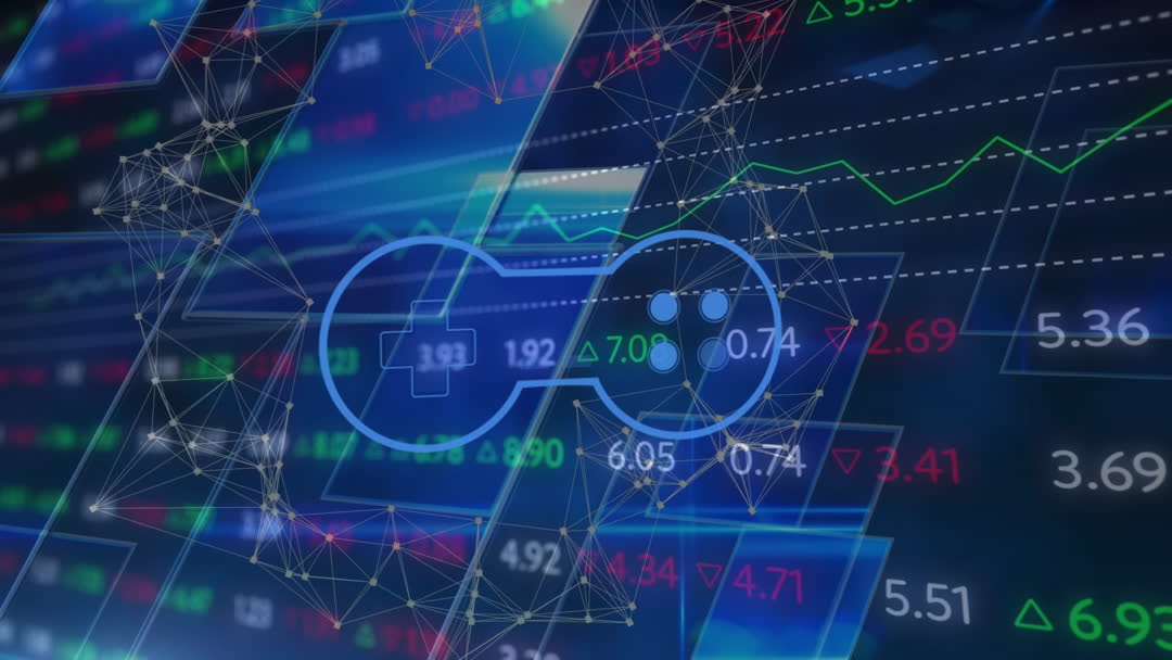 This visual shows a blend of gaming elements and financial data, symbolized by an animated gamepad overlapping dynamic digital graphs and financial charts. It captures themes of technology, game industry influence, and economics. Suitable for illustrating articles or presentations on digital economy integration, the intersection of gaming and finance, or innovation in digital entertainment sectors.