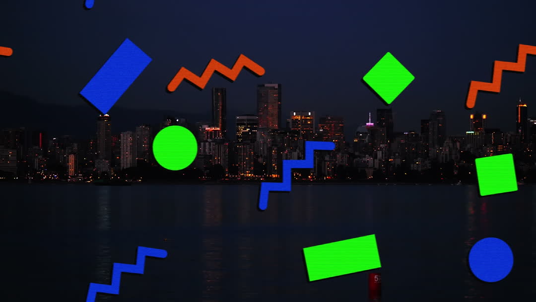 Dynamic animation merges vibrant geometric shapes with a cityscape under evening skies. Creates a modern depiction of urban life infused with digital creativity. Ideal for conveying technology themes, city life concepts, or adding creative flair to visual projects.