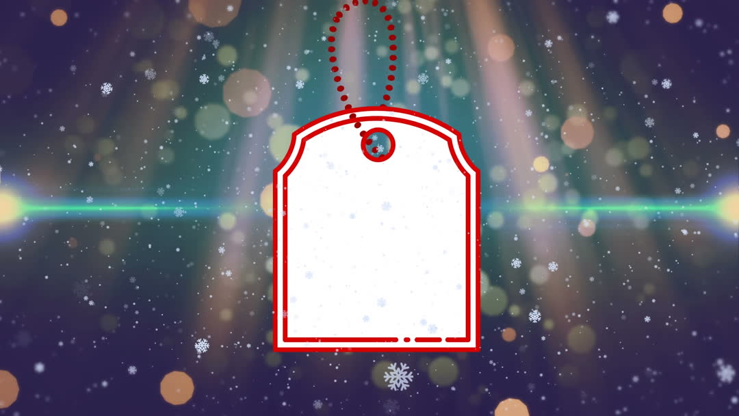 Animated scene showing a festive gift tag overlay with snowflakes falling against an abstract bokeh and light background. Suitable for holiday greetings, promotional videos, and festive-themed presentations.