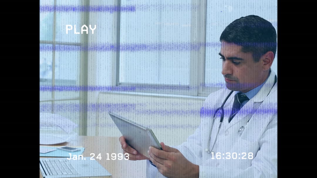Features doctor in professional attire interacting with digital device. Distinct glitch effect provides vintage appeal, simulating retro video recording. Useful for projects illustrating the intersection of technology and healthcare, themes of innovation, or online medical education content. Suitable for presentations on digital transformation in medicine or creative video edits.