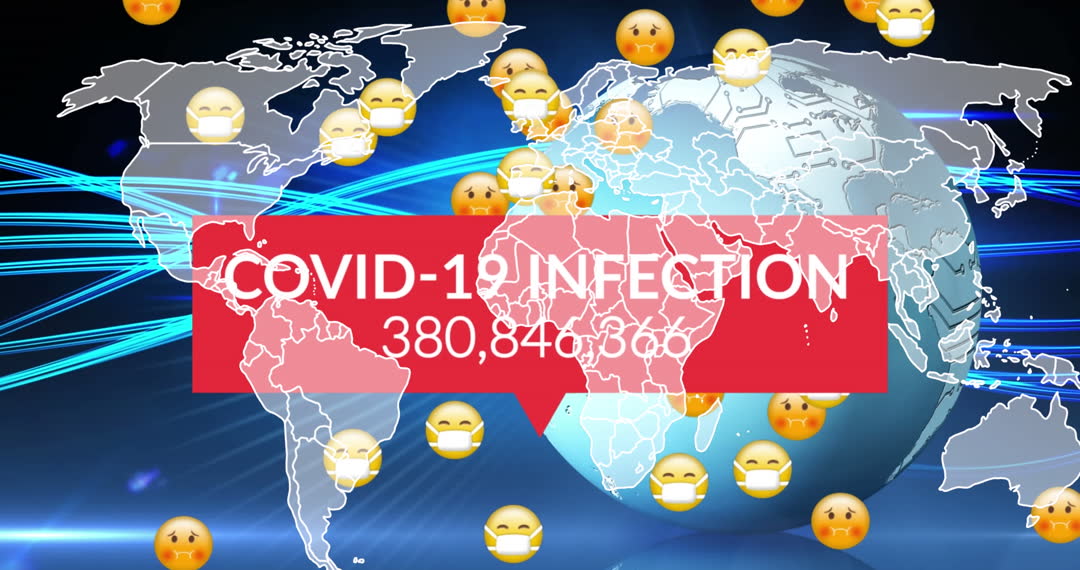Animated visualization highlights global COVID-19 infection rate with face mask emojis on a world map. Digital effects show interconnected data pathways, emphasizing the spread of the virus. Useful for educational materials, health awareness programs, and presentations on global impact of COVID-19 and public health strategies.