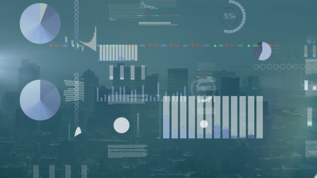 Animation illustrates global data analytics and economic statistics overlaying a modern cityscape. Imagery of charts and graphs signifies digital connectivity and data analysis, making it suitable for presentations on business trends, technological advancements, finance industry insights, and digital transformation themes.