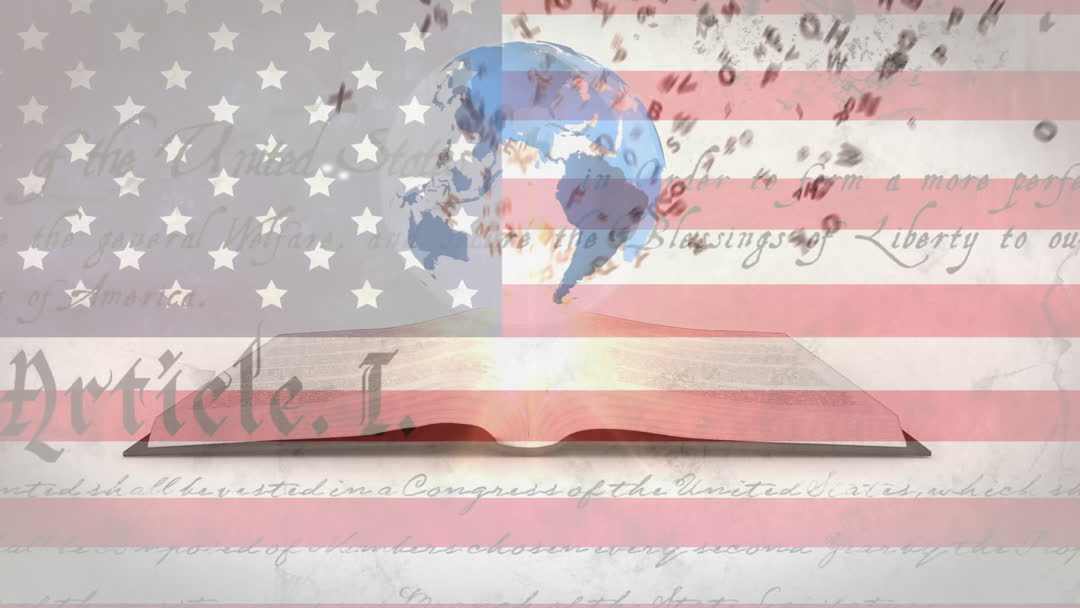 Incorporating the symbolism of the United States with the US flag and Constitution overlays, the animation features a globe and an opening book producing cascading letters, symbolizing the spread of knowledge and global influence. Use for educational videos, patriotic presentations, historical documentaries, or discussions on constitutional rights and global awareness.