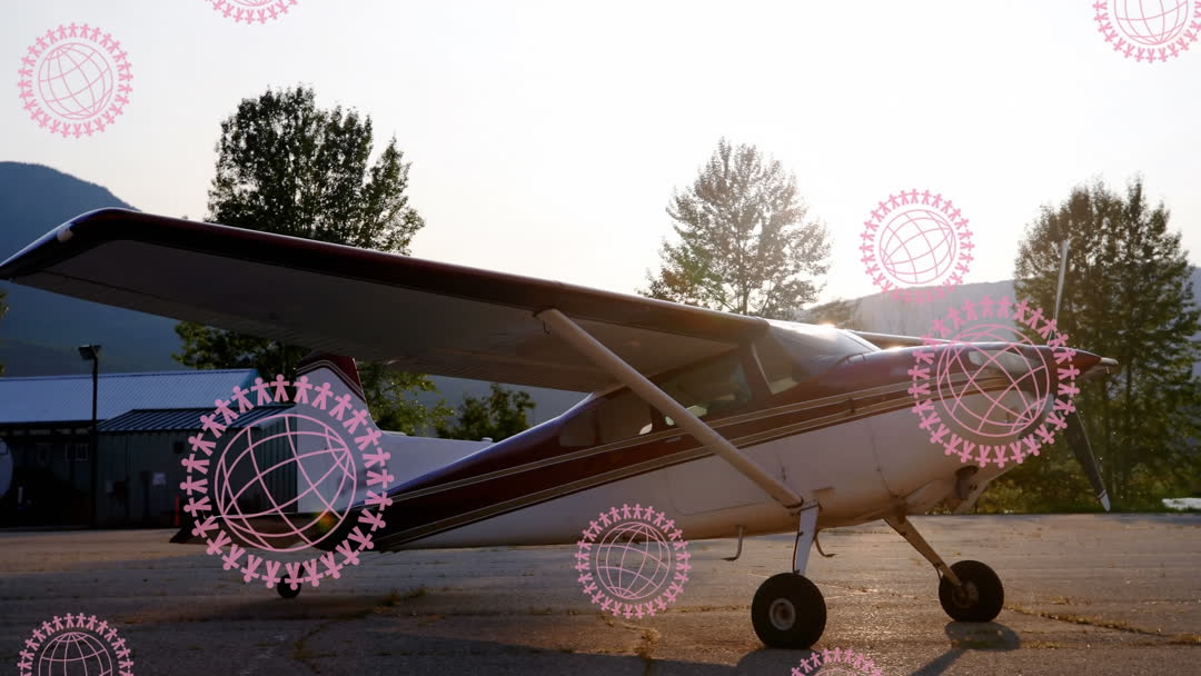 Animation of globe icons overlaying a stationary small aircraft on tarmac. Digital videory conveys concepts of global business, finance, technology. Ideal for presentations, business videos, travel promotions, modern innovation themes.