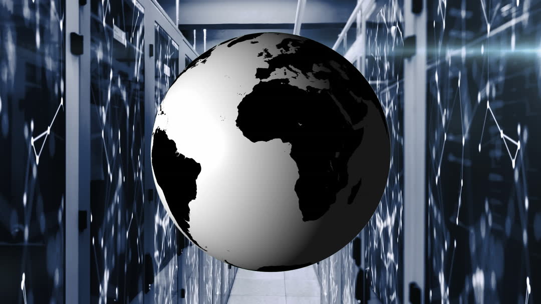 This animation shows a digital globe superimposed on a data server, enhancing the concepts of global business, digital networking, and advanced technology. Ideal for use in presentations about global data networks, futuristic tech transformations, or virtual business strategies.