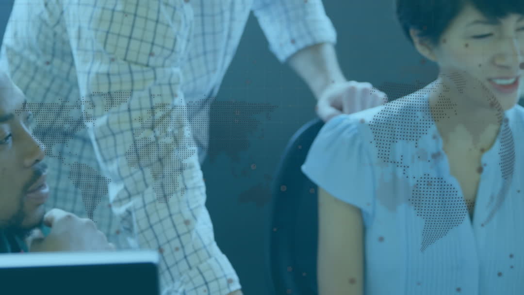 - Animated Globe Overlay on Diverse Coworkers in Modern Office