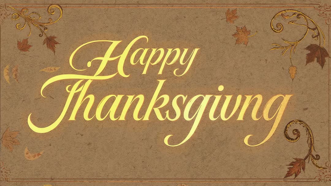 AI Generated Image. Presenting animated gold cursive 'Happy Thanksgiving' sweeping across vintage parchment background with subtle drifting leaves and ornate corner flourishes. Featuring warm golden glow, textured paper grain, thin decorative border, and smooth script reveal animation ideal for looping or short intro clips. Suggesting uses: social media holiday posts, e-card intros, website hero banners, email headers, retail digital signage, event openers, family newsletter animations, and invitation video overlays. Recommending pairing with soft piano or acoustic background track and adding custom text or logo for branded greetings. Supplying versatile color and duration adjustments for use in broadcast, online ads, seasonal campaigns, and printable stills derived from video frames.