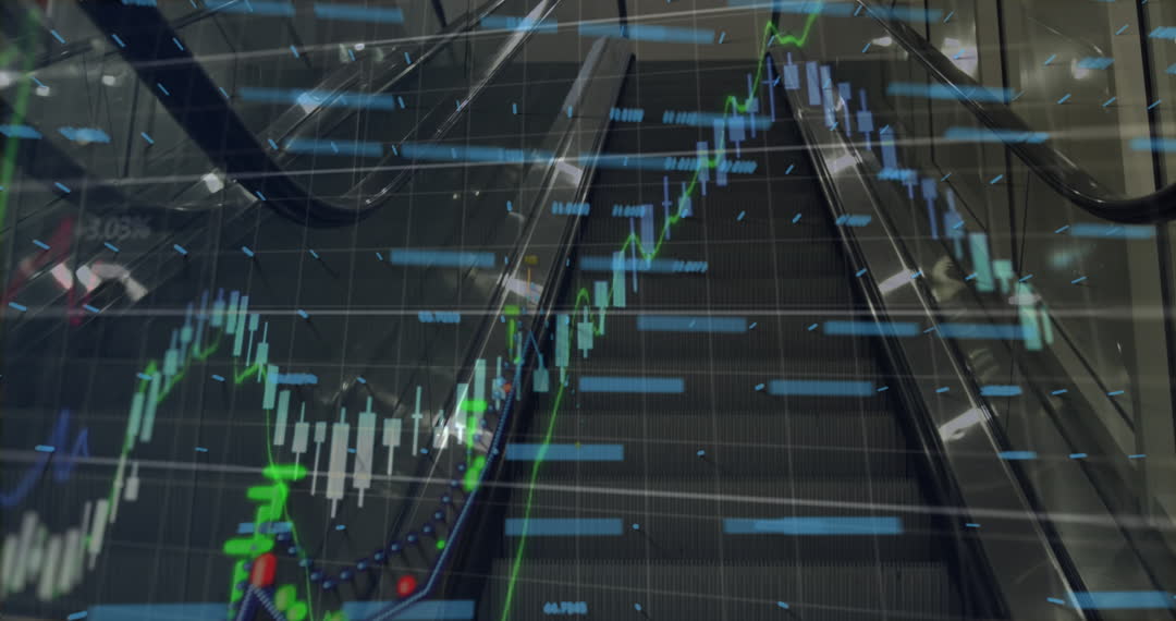 Dynamic view of moving escalator combined with floating financial graphs, illustrating connection between urban life and the fast-paced financial sector. Ideal for content highlighting finance, travel or modern business operations and conveying themes of mobility, growth, and technology.