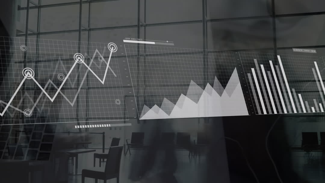 This video showcases animated graphs and charts superimposed onto a modern office setting, illustrating concepts of business analysis, technological advancement, and data visualization. It captures a dynamic blend of statistical progress and business environment, ideal for uses in corporate presentations, technology-related articles, and reports illustrating global business trends.
