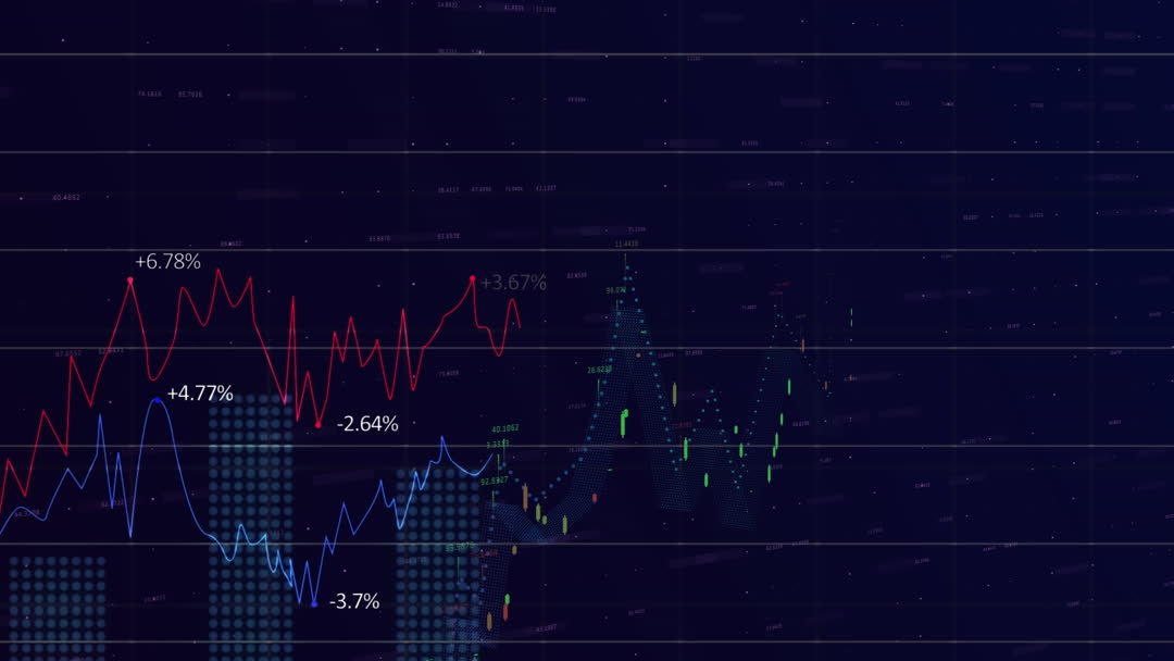 The dynamic animation displays various graphs indicating business growth. With percentages and fluctuating lines in blue and red, it conveys financial analysis in a digital setting. This is ideal for presentations on market strategies, business growth forecasts, and financial analysis. Communicate complex information in an engaging visual format.