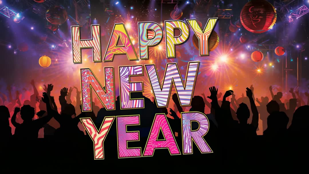 AI Generated Image. Featuring animated HAPPY NEW YEAR typography with changing fill patterns and pulsing stage lights, silhouetted crowd cheering and colorful lanterns creating high-energy festival vibe. Serving as loopable concert opener, social media countdown clip, livestream intro, or nightclub VJ visual, with strong beat-friendly cuts and bright neon color palette. Adding royalty-free party music, syncing cuts to beats, overlaying logo on lower third, and rendering seamless loop with fade are recommended for quick delivery. Rendering in 1920x1080 or 4K for broadcast, exporting alpha-enabled version for compositing, and using for event promos, corporate holiday greetings, website hero banners, email headers, or retail display signage.