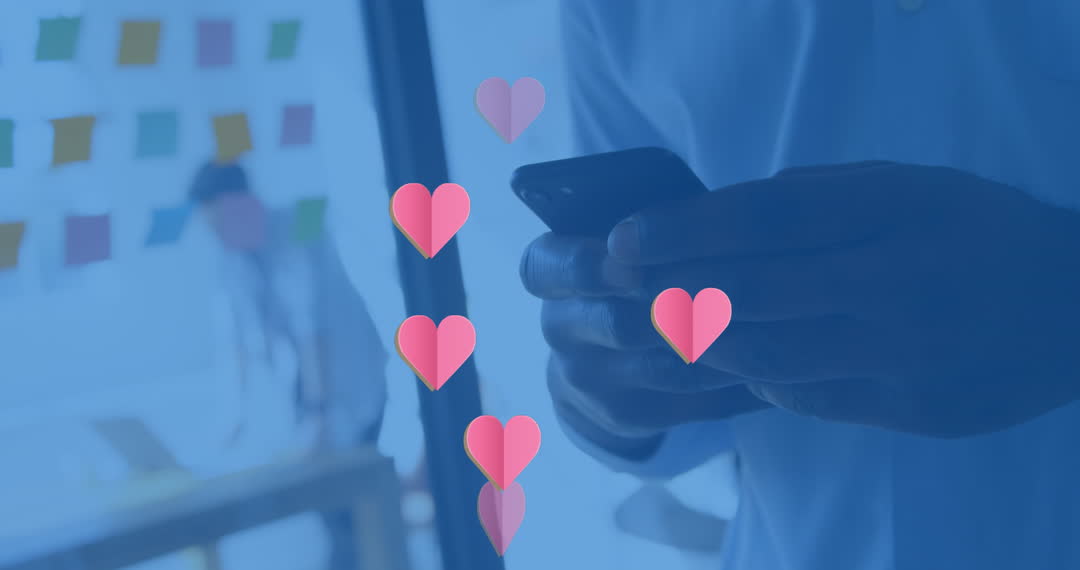 - Animated Hearts Over Man Using Smartphone in Office Setting