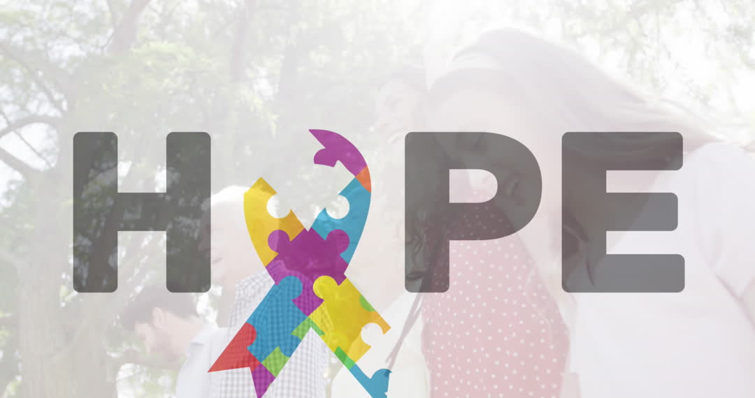 Graphic featuring the word 'Hope' where the letter 'O' is replaced with autism awareness ribbon of colorful puzzle pieces. The background shows an animated Caucasian family, symbolizing support and inclusivity. Perfect for use in campaigns, educational resources, social media promotions, or showcasing support for Autism Awareness Month.