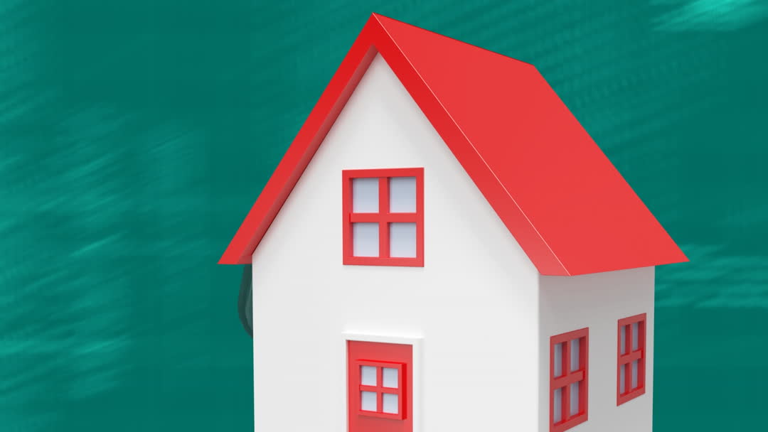 3D animated house with a vibrant red roof contrasts against a digital-themed green background. This concept combines elements of global business, technology, and innovative digital interfaces. Ideal for representing digital housing markets, data management in real estate, or employment in technology sectors. Useful for marketing technology products or services related to digital real estate solutions, data processing tools, or innovative sets in financial platforms embracing modern and interactive approaches.