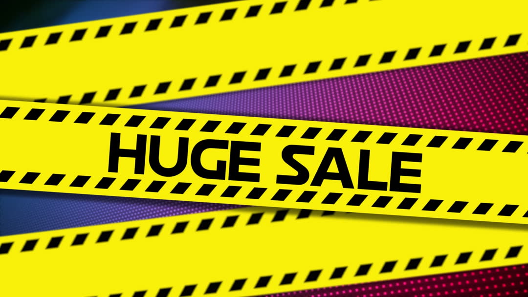 - Animated Huge Sale Banner with Yellow Tape and Dotted Pattern