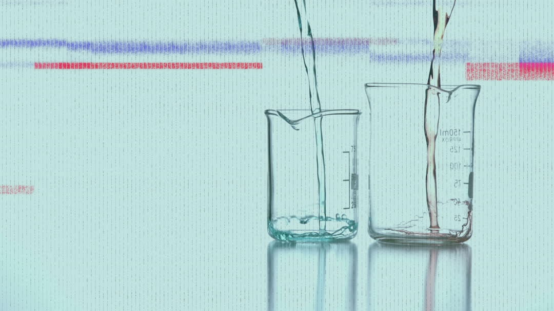 Visual depicts liquid streaming into beakers, incorporating digital interference. Represents scientific research or experiment in laboratory. Could enhance content related to chemistry, educational presentations, or modern science communications.