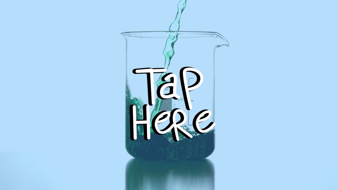 Illustrated digital animation showing green liquid pouring into a clear beaker on a light blue background. The words 'Tap Here' are displayed prominently. Suitable for educational content, science demonstration videos, and digital communication concepts involving chemistry experiments.