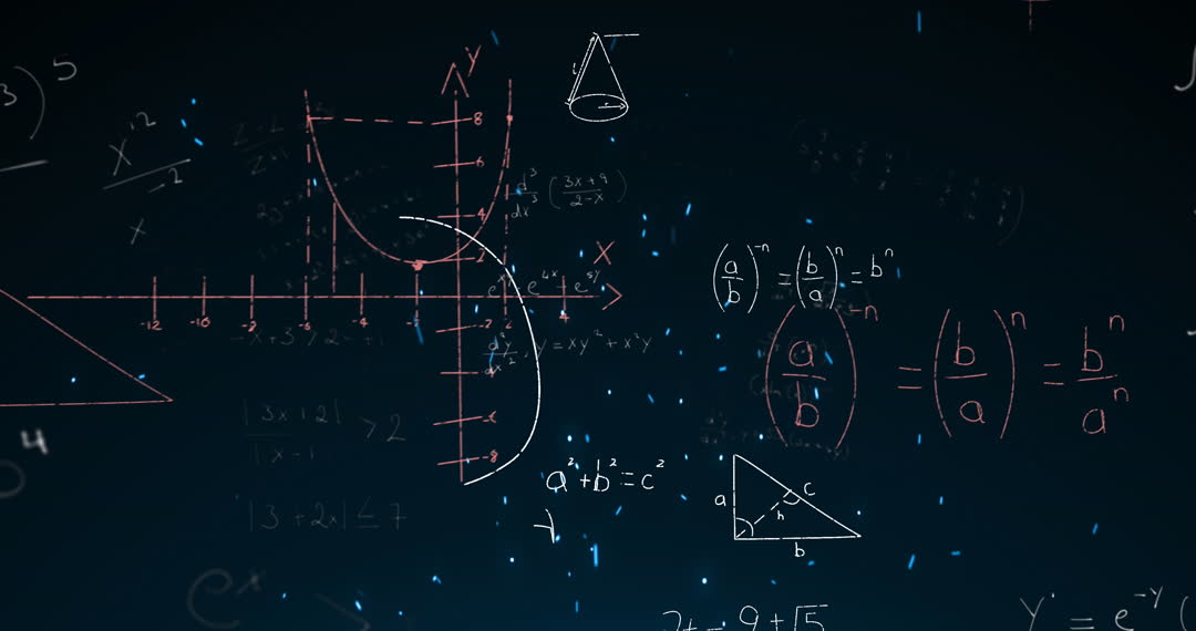 Illustration depicts animated mathematical equations and symbols on a dark digital background. Useful for educational materials, scientific presentations, instructional videos on mathematics or technology integration in education. This visual emphasizes the intersection of technology and learning, ideal for use in academic or professional environments.