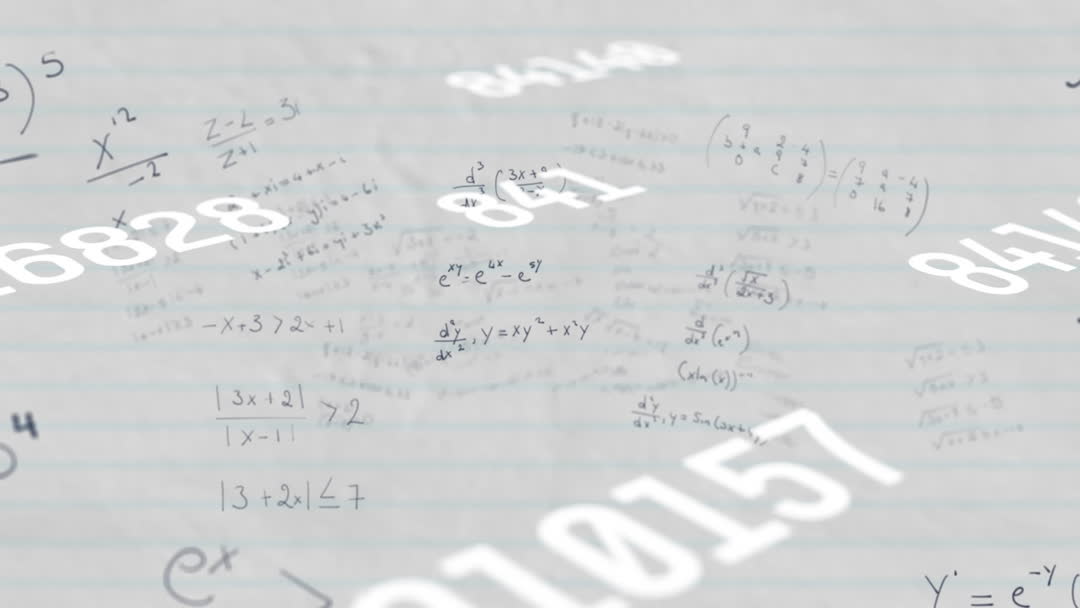This animation features changing numbers and various mathematical equations on a background of white lined paper, representing educational and academic themes. Ideal for use in educational materials, math tutorial resources, and school websites to visually represent complex problem solving and mathematical learning concepts.