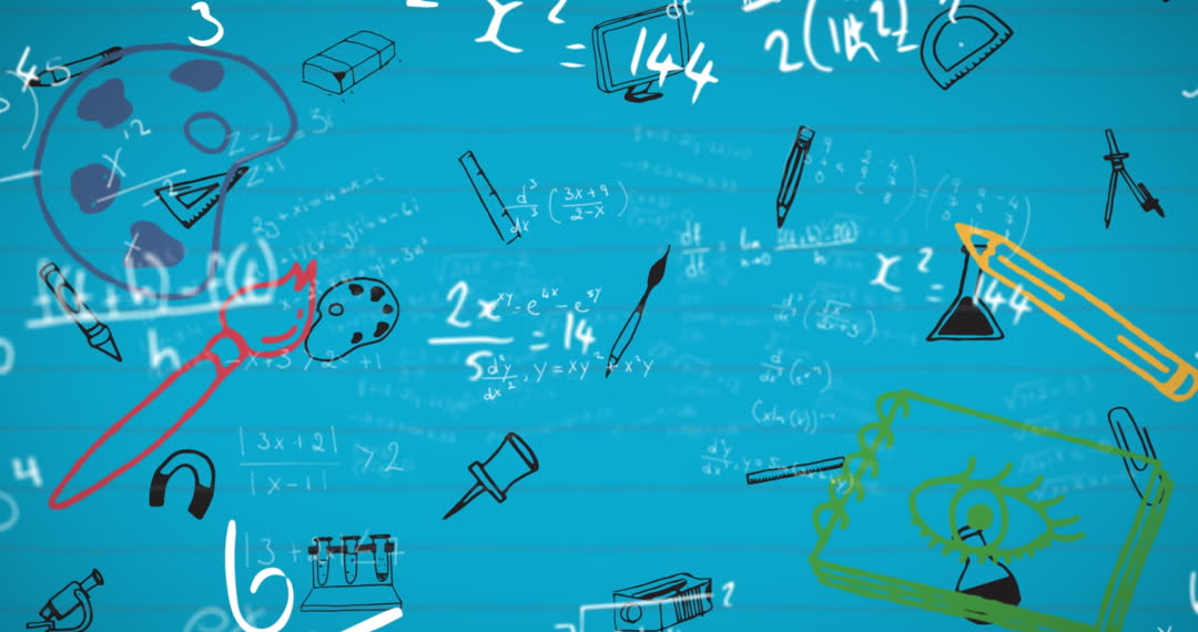 Abstract collage of mathematical symbols and artistic tools against blue backdrop evokes theme of creative learning. Useful for educational materials, math and science classroom visuals, or inspiring digital content on innovative approaches to teaching STEM subjects.