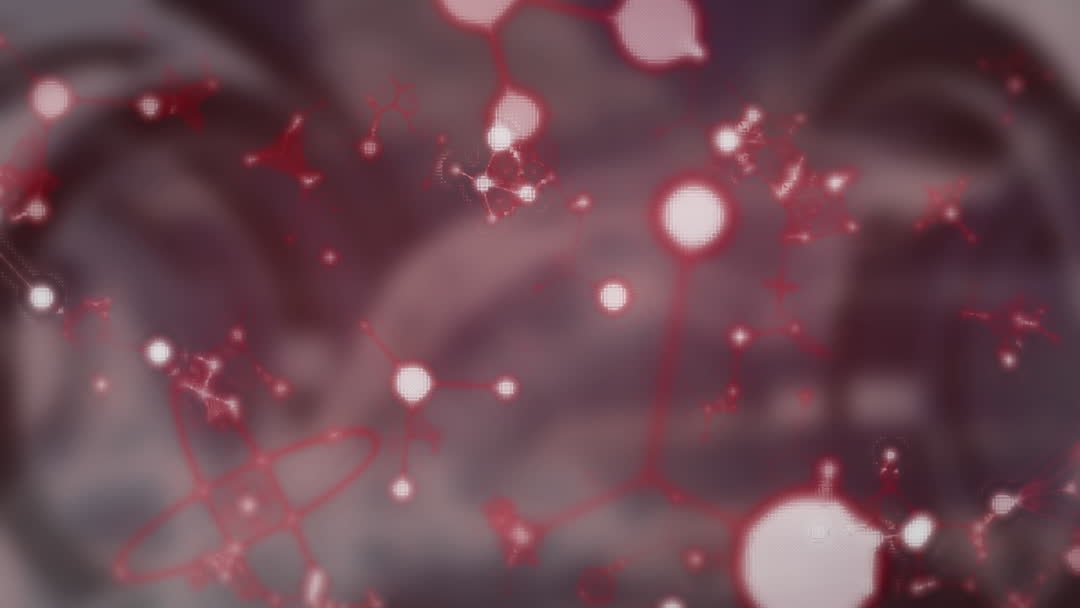 Abstract animation showing molecules moving across a digital art background suggests innovation and scientific progress. Vivid red highlights conjure themes of connectedness and future technology. Useful for illustrating scientific concepts, technology content, or education platforms focusing on molecular biology, chemistry, and digital sciences.