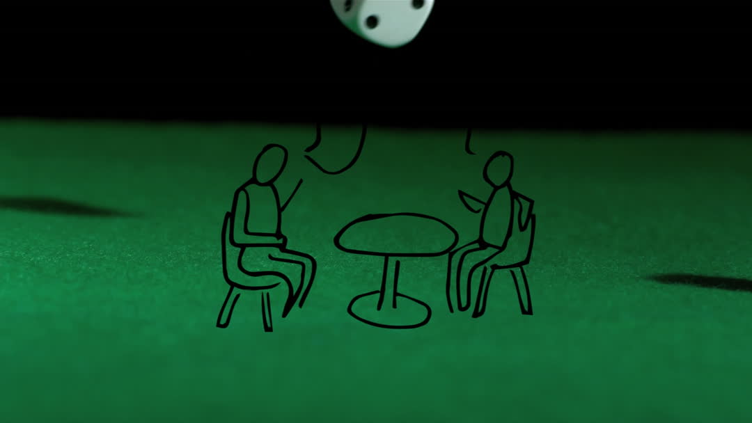 Digital animation shows illustrated molecules interacting with falling dice over a game table. Useful for themes involving gambling, science, entertainment or educational content about probability and gaming concepts.