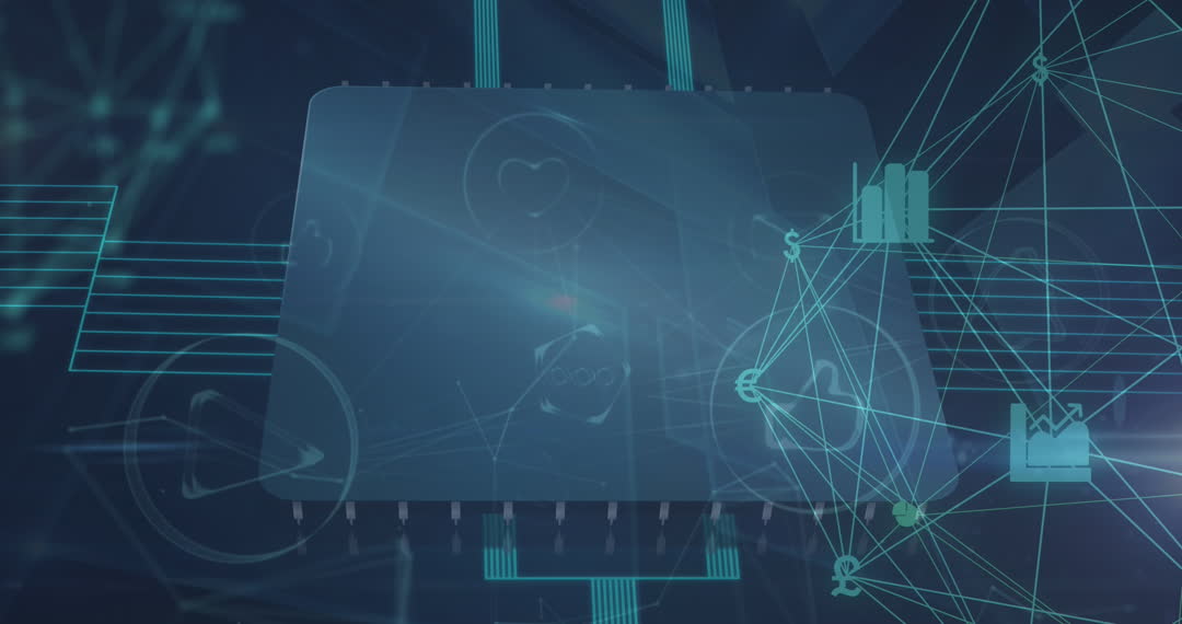 Abstract animation displaying interconnected nodes over a digital microchip, featuring various data processing and finance-related icons. Perfect for illustrating concepts in technology, global networks, data analytics, cross-border trade, and digital transformation presentations.