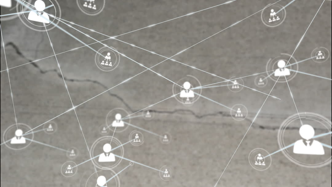 Animation depicts a digital network of interconnected white icons against a grey background with a crack pattern, symbolizing connectivity and contemporary data exchanges. Useful for illustrating concepts related to global communication networks, technology interactions, or online business interconnectivity.