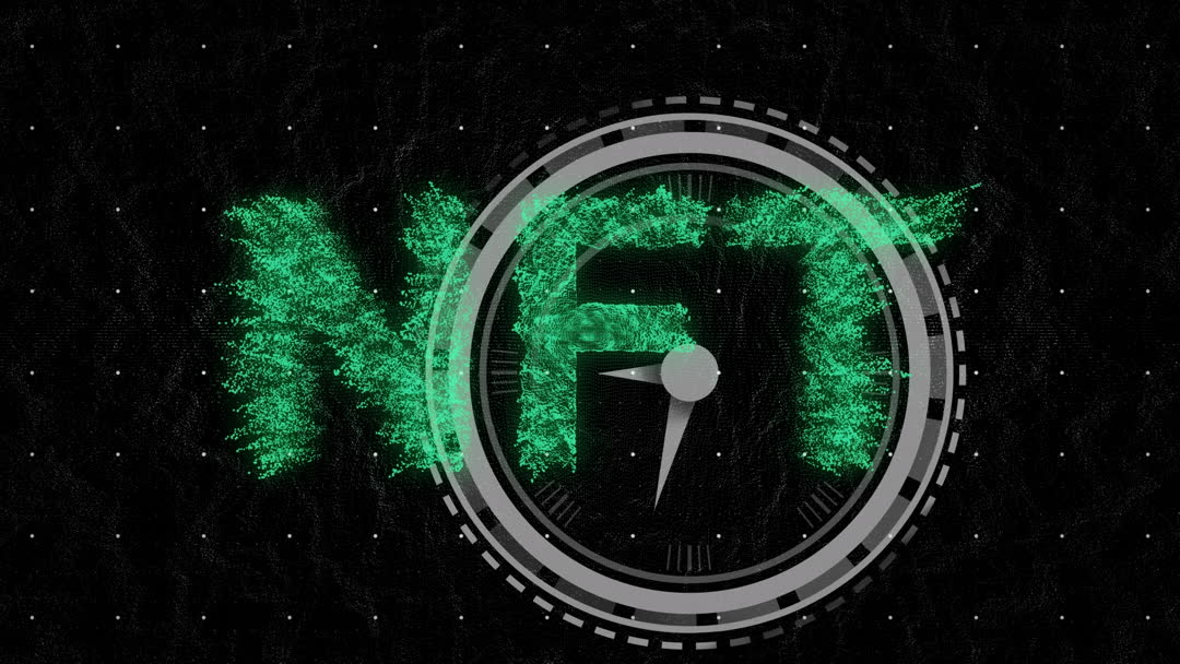 This graphic features the text 'NFT' dynamically represented over a digital clock background, symbolizing the intersection of the art world with cutting-edge technology. Ideal as an eye-catching visual for articles, presentations, or projects discussing the future of NFTs, blockchain technology, and digital assets.