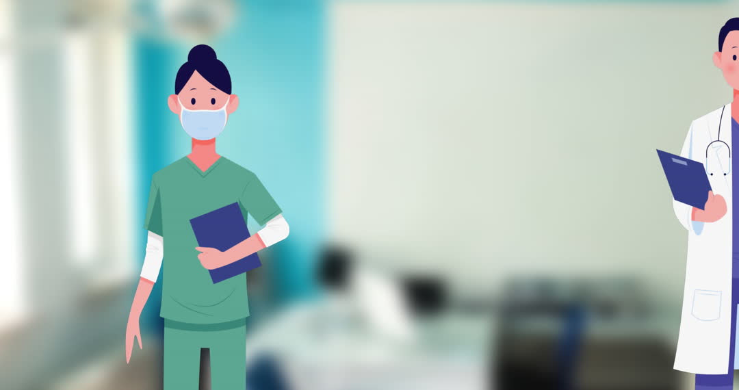 This animation features an illustrated nurse in medical scrubs, holding a clipboard, set against a hospital background. The nurse is wearing a face mask, depicting a healthcare environment. Ideal for animations about healthcare, hospital informative videos, or digital presentations pertaining to medical topics.