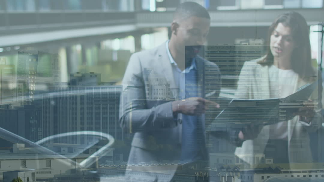 - Animated Overlapping Cityscape and Business Meeting in Office