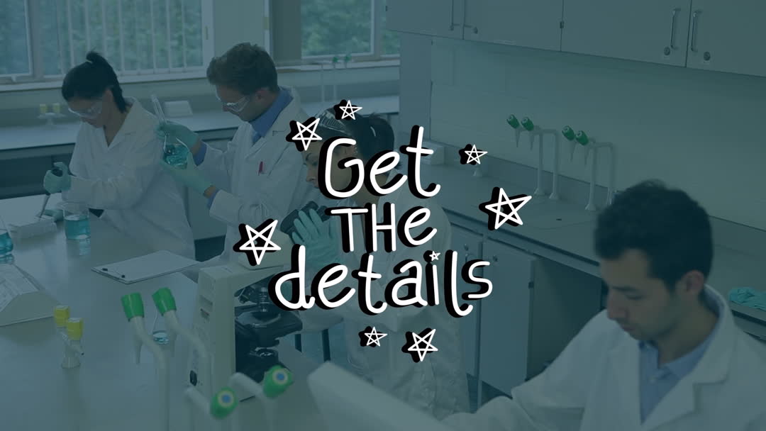 Researchers in white lab coats conducting experiments using lab equipment have an artistic animation overlay with the phrase 'Get the Details'. Suitable for use in promoting scientific research, teamwork, educational content about laboratory environments, or digital communication about scientific advancements and details.