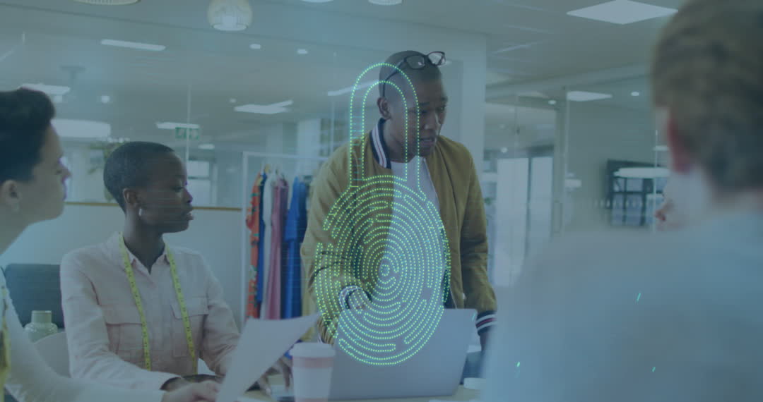 Business professionals in a collaborative office setting with an animated digital padlock symbol highlighting cybersecurity concerns. Perfect for illustrating concepts of data protection, teamwork, diversity and inclusion in modern corporate environments. Useful for presentations on secure business practices, digital interfaces, and teamwork innovation.