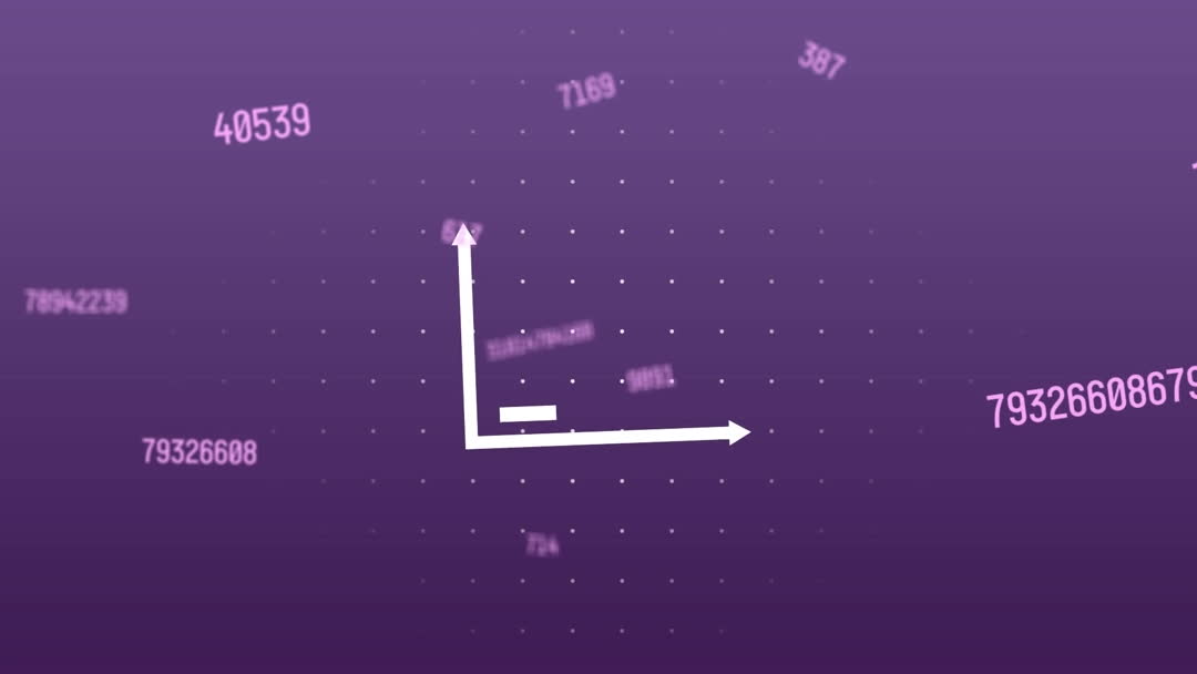 Energetic animation featuring a stylized graph with moving numbers, set against a purple background. This visualization embodies concepts of data processing, statistical analysis, and digital information flow, making it ideal for technology, business, finance, and analytics-related content showcasing trends, solutions, or innovative ideas.
