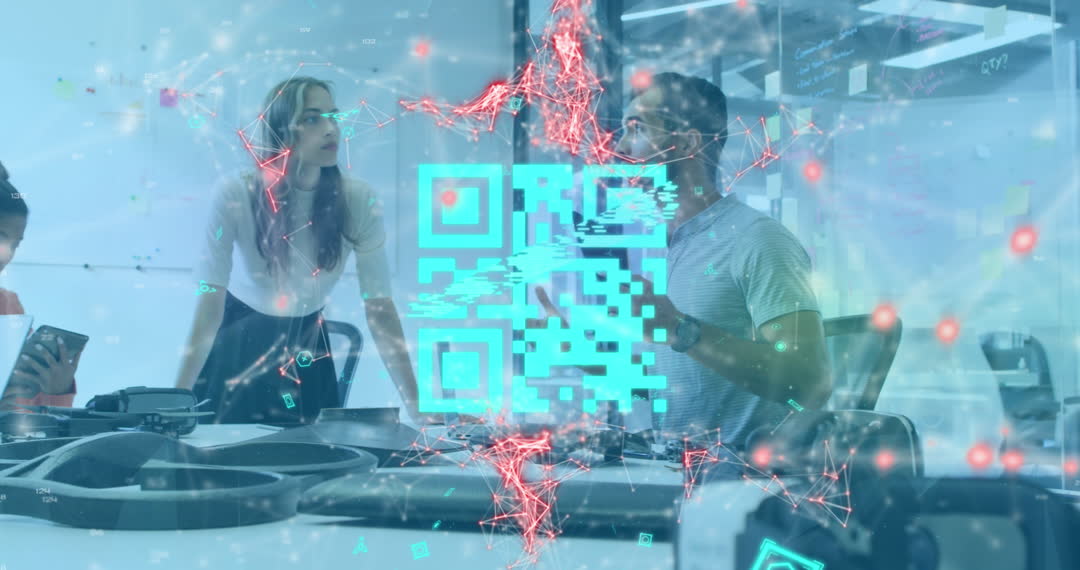 Animated QR code overlays young professionals engaged in a business meeting at a modern office. Depicts themes of digital transformation, online security, and technological advancement. Useful for illustrating innovative business practices, tech startups, and futuristic workplace concepts.