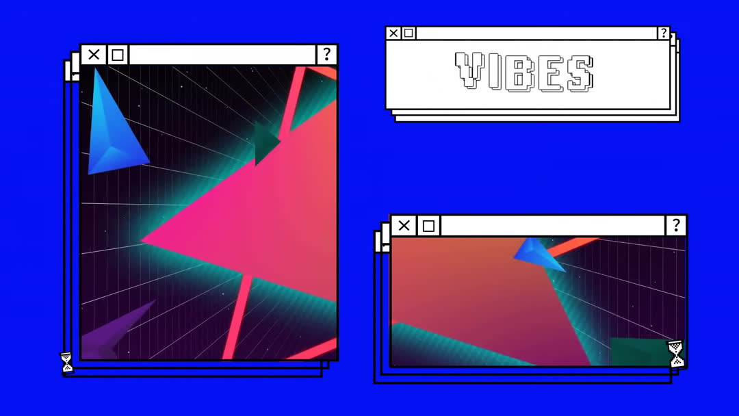 This vibrant and retro animation features geometric shapes and computer screen window tabs. Ideal for digital art projects or as a background for creative ventures, the design evokes a 1980s aesthetic, making it great for content targeting nostalgic or tech-centered audiences.